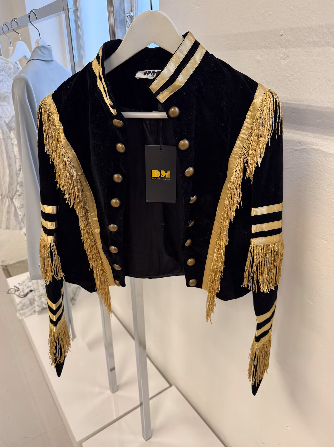 Kavaj med fransar och gulddetaljer.